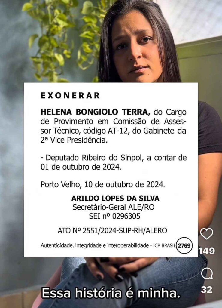 Porto Velho (RO) – A ex-servidora comissionada da Assembleia Legislativa de Rondônia (ALE-RO), Helena Bongiolo Terra, divulgou nas redes sociais um vídeo em que relata ter sido vítima de suposto assédio moral, psicológico e sexual enquanto atuava no gabinete do deputado estadual Ribeiro do Sinpol (Sindicato dos Policiais Civis de Rondônia). Segundo ela, o autor das condutas seria seu chefe , a quem descreve como “homem público, influente e poderoso”.