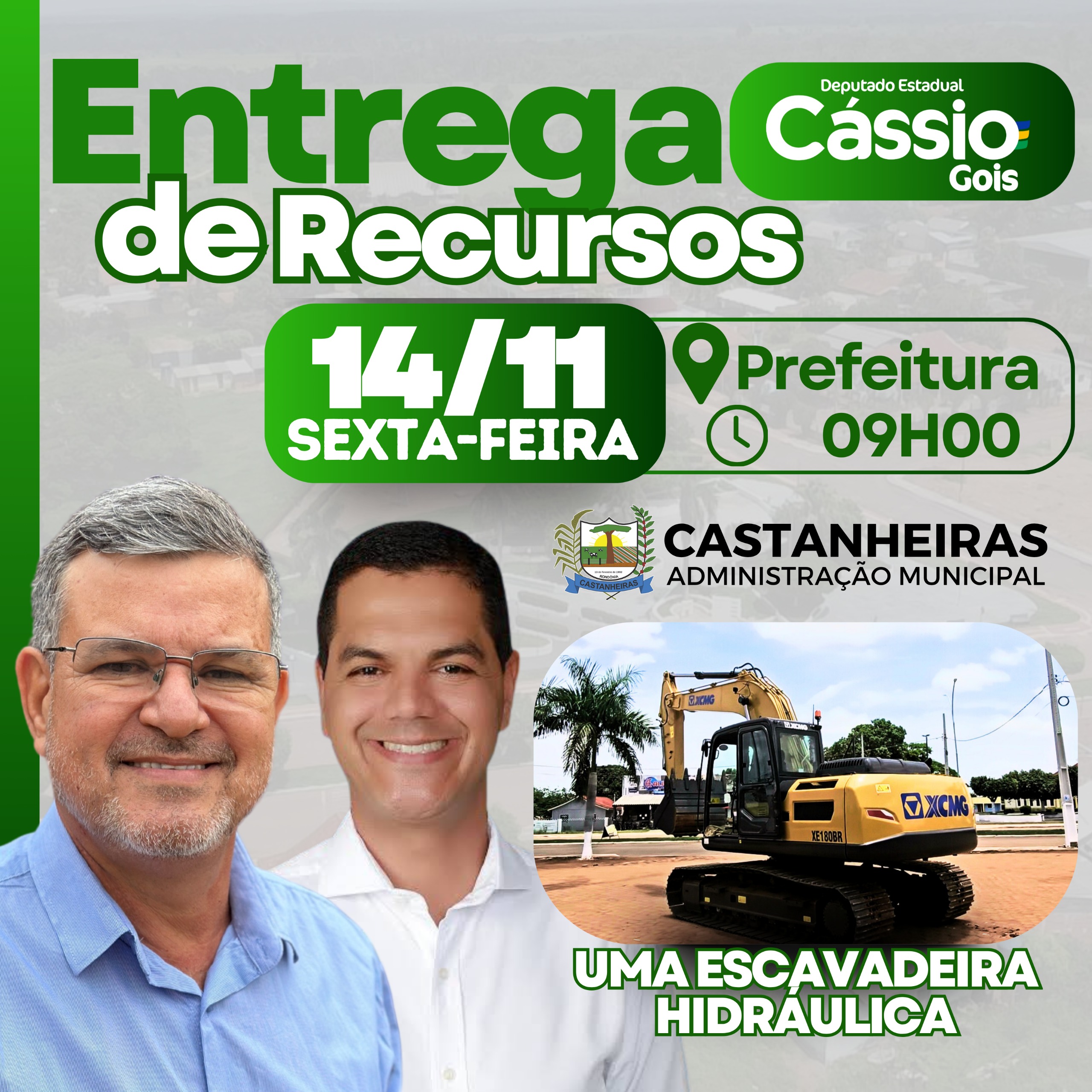 A Prefeitura Municipal de Castanheiras  através do Prefeito Cicero Godoi e o Deputado Estadual Cássio Gois convida toda a população para participar de um momento solene e especial: a entrega oficial de uma Escavadeira Hidráulica, destinada ao município por meio do Deputado Estadual Cássio Gois.