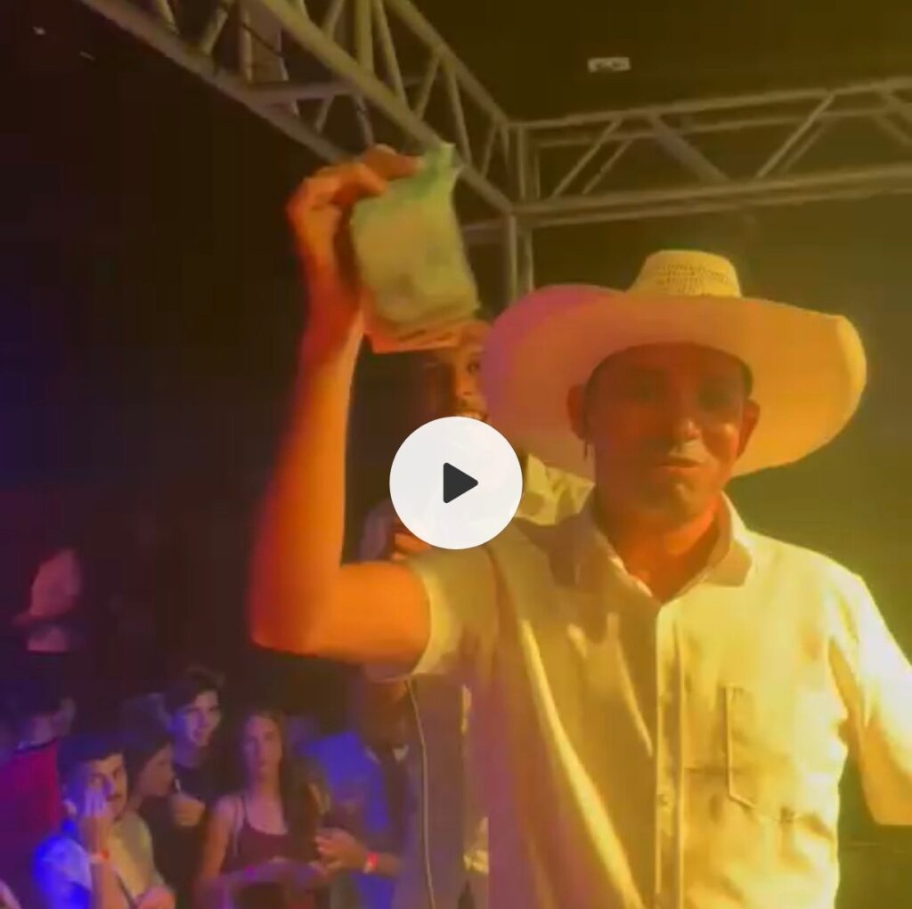 A cena foi registrada em vídeo e mostra o exato momento em que Conejipa, radiante e vibrando com a energia da festa, abre os braços e começa a lançar o dinheiro para a multidão. Em segundos, a galera simplesmente foi à loucura, correndo, pulando e disputando cada nota que caía do palco.